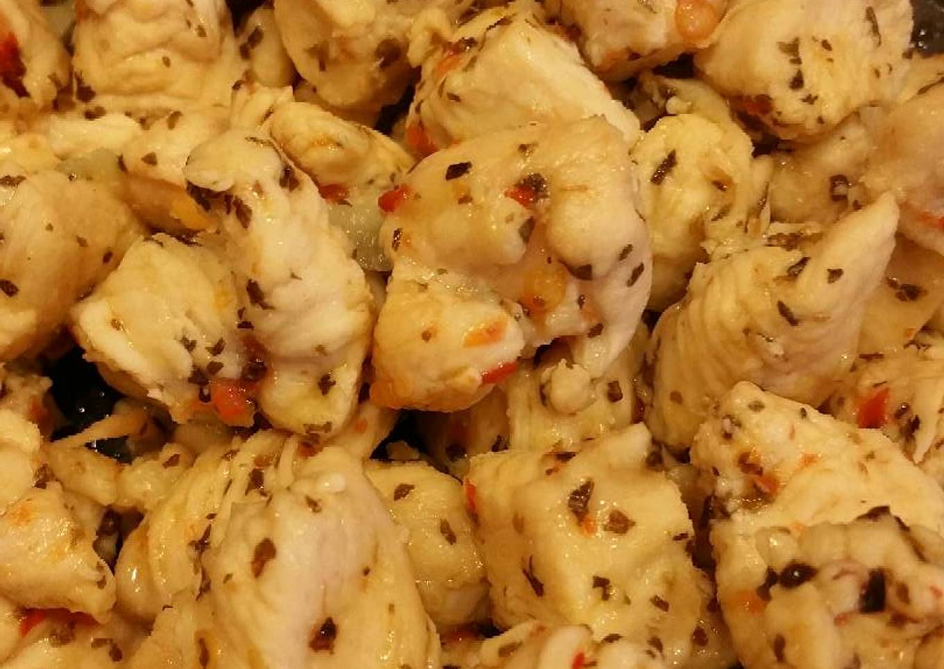 - Cook chicken in pan on medium high heat for 5+min, turning so it doesnt stick. Add 1/4 cup of water to release seasonings from bottom of pan. Stir, cover, and cook on medium low for 10min (until water cooks off).