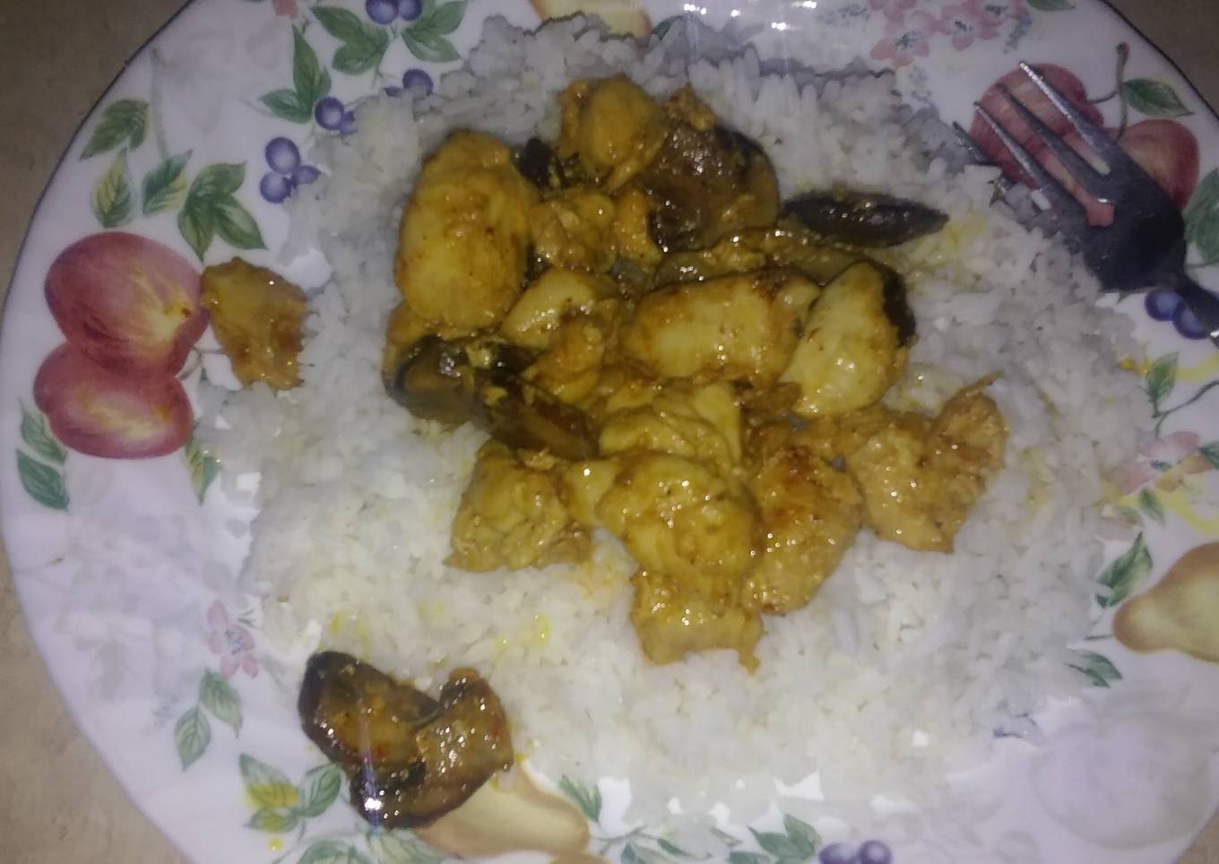 - In a pan cut up chicken and add in mushrooms and butter and cook on low add in spices and let cook until chicken is done add in sweet n sour sauce and let simmer until sauce is incorporated serve over rice