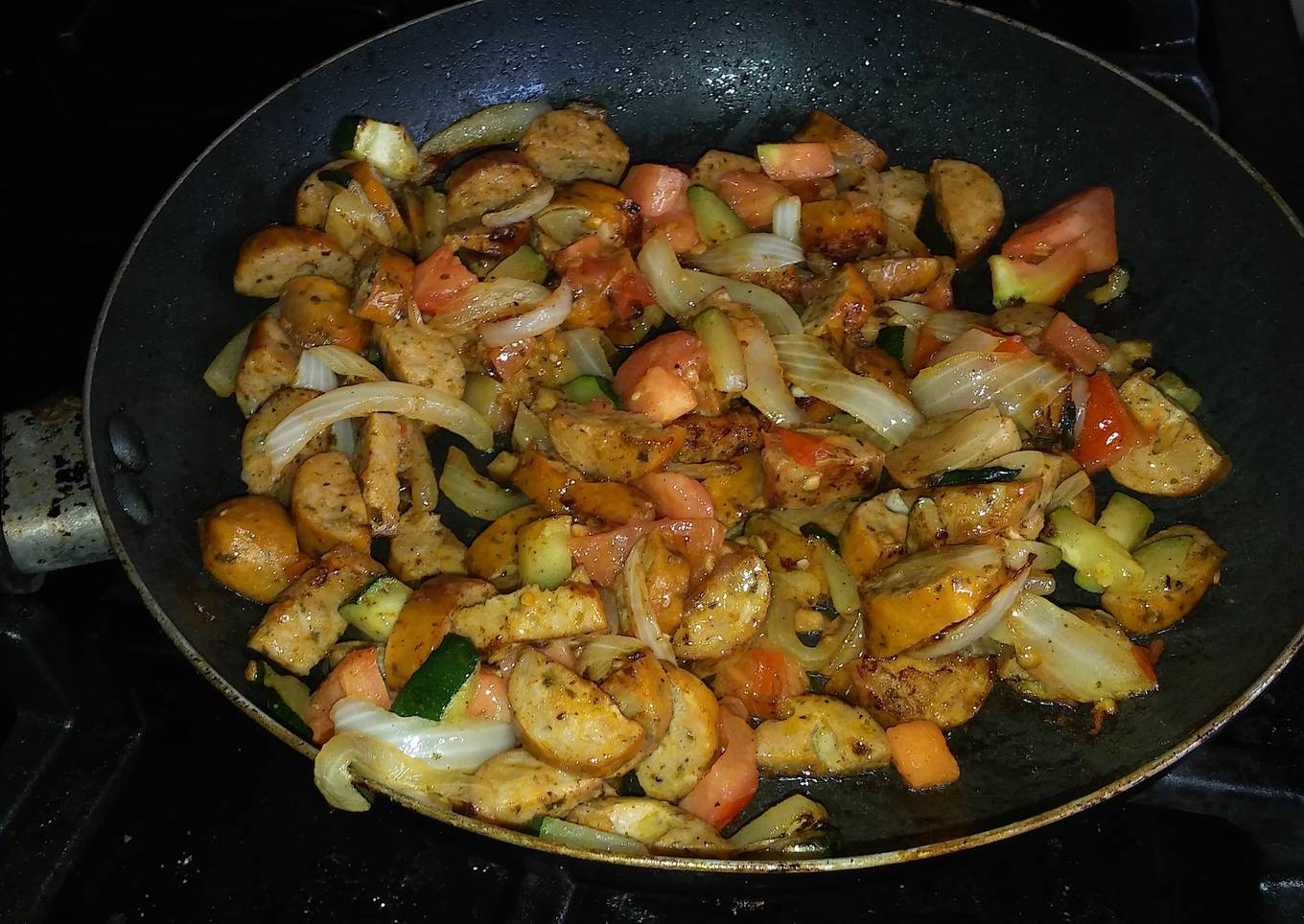 - Add onions, zucchini and salt. Saute until tender crisp. Add chicken sausage and saute until good and headed through.