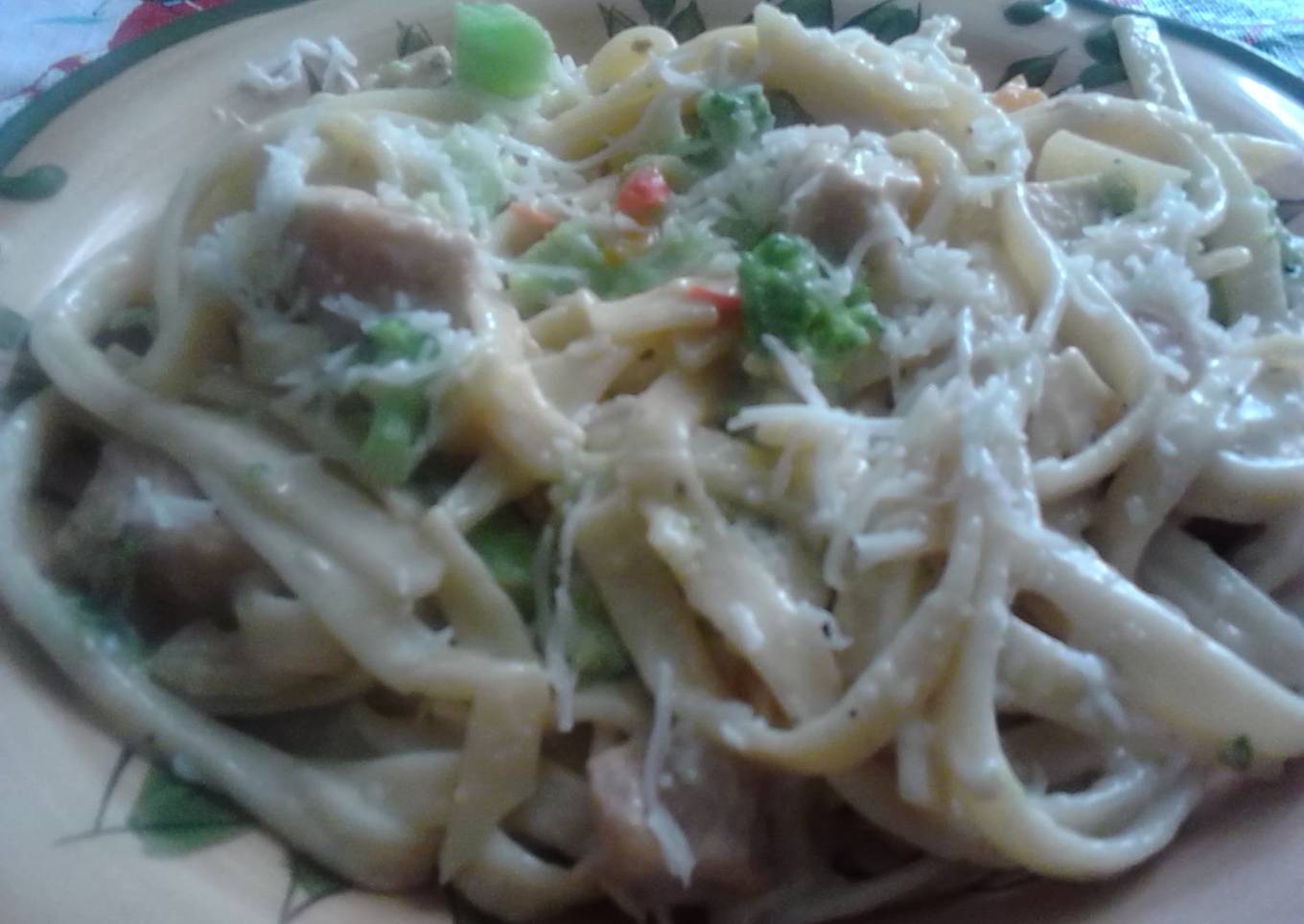- Drain pasta noodles and place all ingredients together, add Alfredo Sauce and mozzarella cheese.