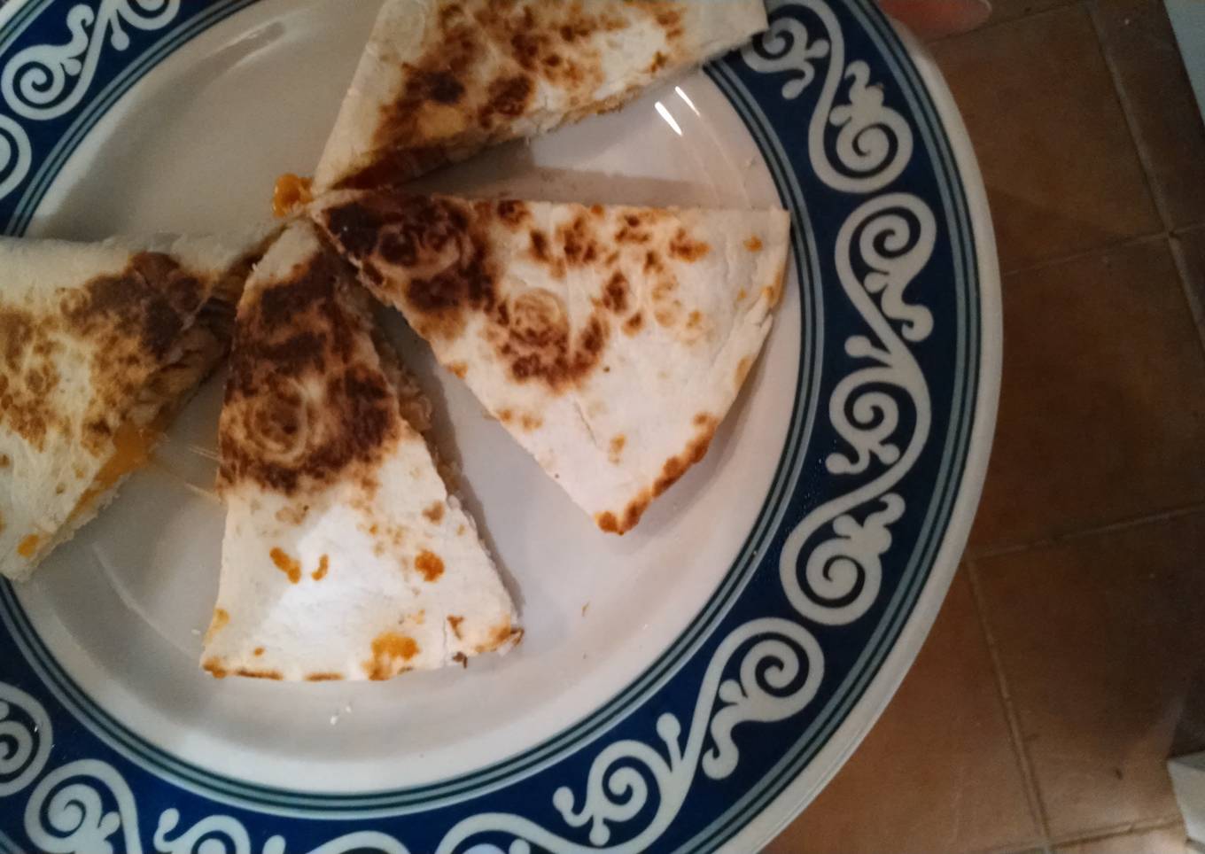 - Get separate larger skillet and place tortilla in this. Add small amount of chicken(if you add too much your tortilla will fall apart). Add cheese to taste(I like a lot; this melts so that's okay). Heat over low heat until tortilla starts to feel firm. Fold over and continue cooking until both sides have crisped(I like mine slightly burnt) and cheese is melted. Enjoy!